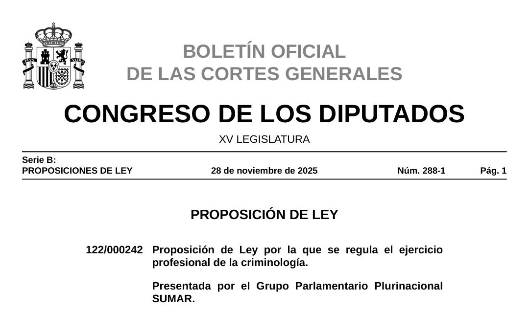 El passat 28 de novembre, el Congrés dels Diputats va admetre a tràmit la proposició de llei 122/000242, que estableix un marc legal per a l’exercici professional de la criminologia. Aquesta iniciativa, fruit del treball conjunt dels Col·legis de Criminologia d’Espanya, representa un pas decisiu cap al reconeixement institucional de la nostra professió.